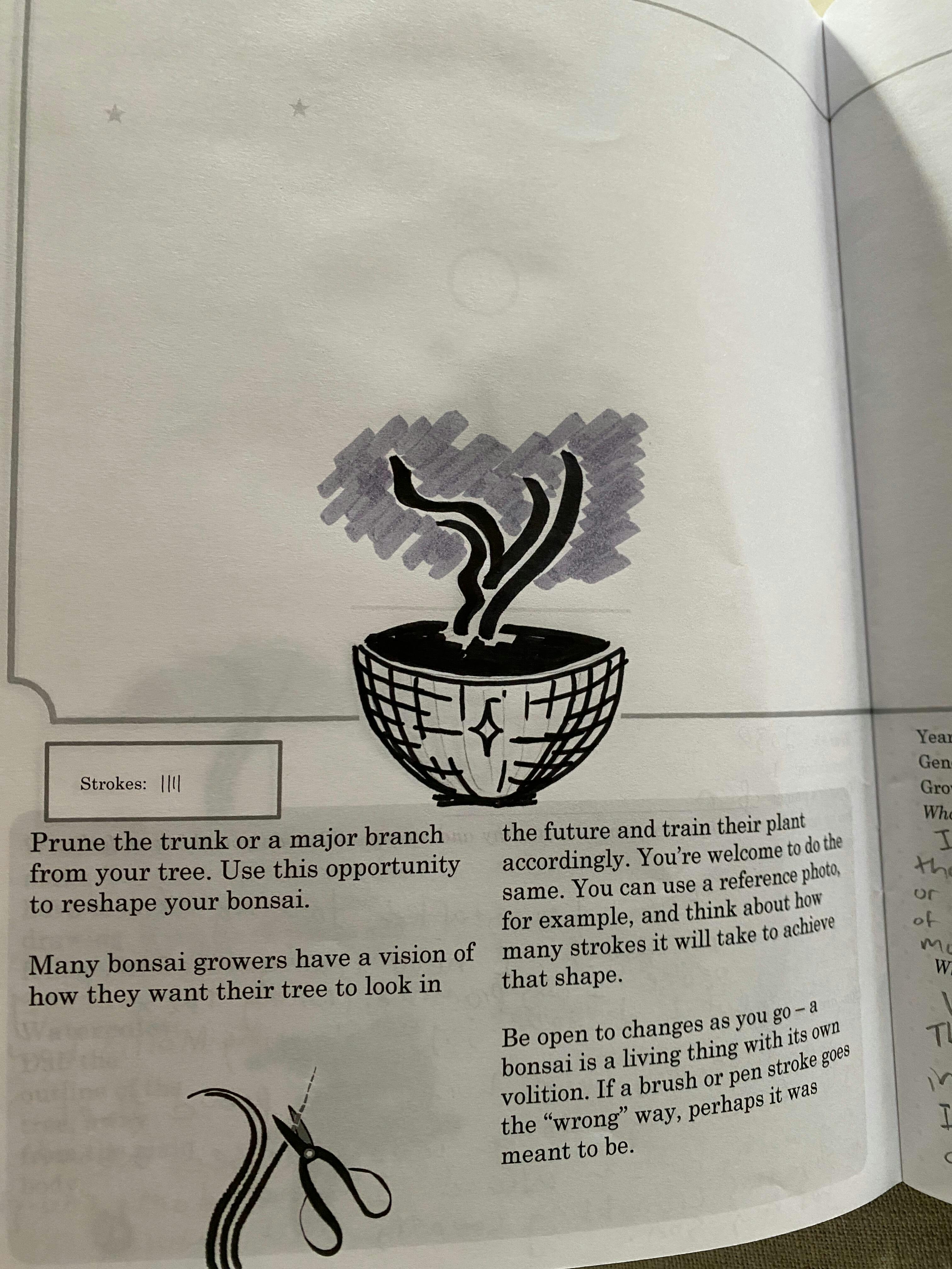 Use simple brush or pen strokes to shape your bonsai. On each new page, trace your previous bonsai and add one more stroke. Watch your bonsai grow, page after page. Draw impulsively, or draw with intention.